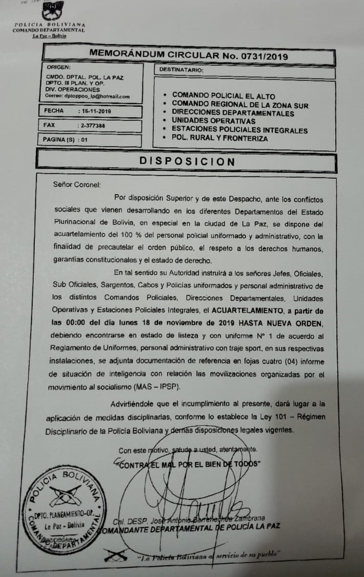 EN CUMPLIMIENTO  AL PRESENTE MEMORÁNDUM CIRCULAR  SE DISPONE ACUARTELAMIENTO GENERAL DESDE HORAS 07:00 AM EN SUS ENTIDADES MAS PRÓXIMAS AL CENTRO DE LA CIUDAD